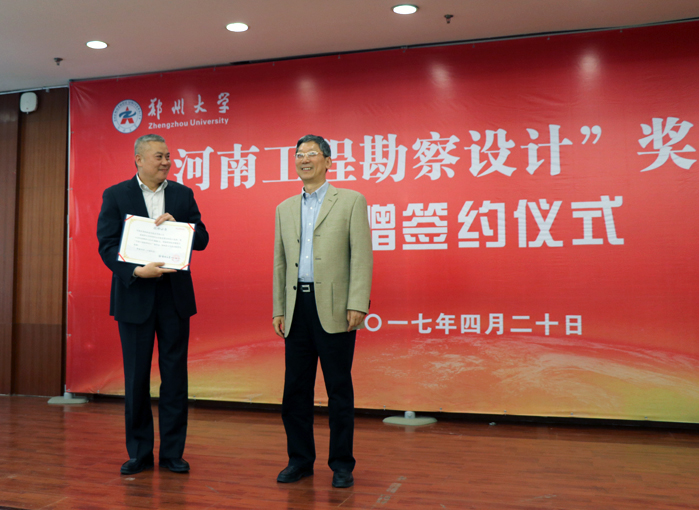 4月20日,“河南工程勘察設(shè)計(jì)”獎(jiǎng)學(xué)金簽約儀式在鄭大校園舉行。日海恒聯(lián)通信技術(shù)有限公司是捐資企業(yè)之一,該公司總經(jīng)理?xiàng)钚路迳吓_(tái)領(lǐng)取捐贈(zèng)證書(shū)。
