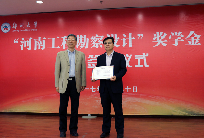 4月20日,“河南工程勘察設(shè)計”獎學(xué)金簽約儀式在鄭大校園舉行。化工部鄭州地質(zhì)工程勘察院是捐資企業(yè)之一,該公司法定代表人姜炎濤上臺領(lǐng)取捐贈證書。