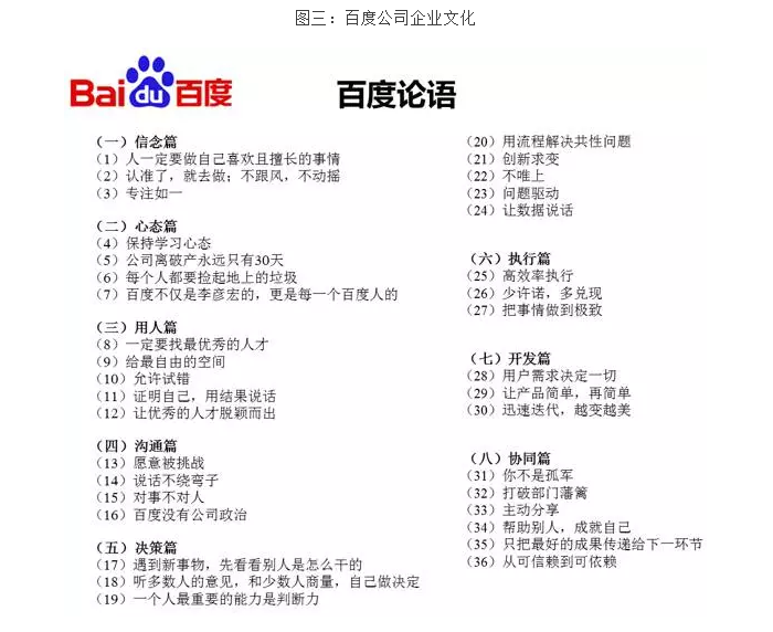 為什么需要從復(fù)雜到簡單?因?yàn)樵胶唵卧接行В胶唵卧饺菀桌斫狻2皇撬械膯T工對“國學(xué)”感興趣,也不是所有的員工都能準(zhǔn)確說出宗旨的定義。與其絞盡腦汁思考很多看上去很美的文字,還不如用簡單和具備時(shí)代感的語言把意思表達(dá)清楚。以互聯(lián)網(wǎng)巨頭百度公司的企業(yè)文化為例,便體現(xiàn)了簡單的企業(yè)文化表達(dá)方式。百度公司的企業(yè)文化叫“百度論語”。為什么起這樣的名字?據(jù)說百度的企業(yè)文化形成過程中,是工作人員拿著錄音筆跟在李彥宏身后,就企業(yè)管理中的問題問他的想法,然后提煉出的相關(guān)理念,有點(diǎn)類似于《論語》的形成是孔子的弟子跟在孔子身后發(fā)問與記錄一樣。《百度論語》包括8個(gè)篇章36條法則,既是企業(yè)文化核心理念,又是員工行為準(zhǔn)則,如下圖所示。