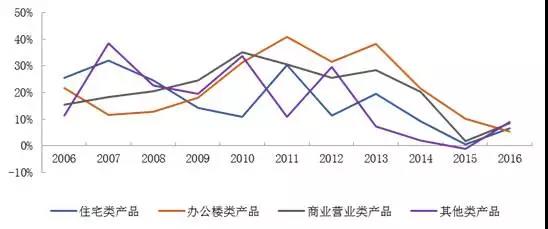 從產(chǎn)品類別上看,住宅、辦公樓、商業(yè)營(yíng)業(yè)類投資增長(zhǎng)普遍放緩。