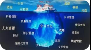 過去提到質(zhì)量管理,就很容易只想到或看到表面上的勘察設(shè)計(jì)項(xiàng)目質(zhì)量,而導(dǎo)致項(xiàng)目差錯甚至失誤的深層次原因沒有被重視和挖掘。項(xiàng)目層面的問題只是冰山一角(如下圖),構(gòu)成支撐和支持作用的隱藏在冰山下面的企業(yè)文化、風(fēng)險(xiǎn)管理、科技創(chuàng)新、知識管理、人力資源管理、績效考核等方面的問題以及結(jié)合業(yè)務(wù)特點(diǎn)的精細(xì)化管理制度不完善等問題,才是導(dǎo)致質(zhì)量問題反復(fù)出現(xiàn)的深層次原因。