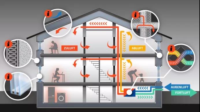 這是一棟最具現(xiàn)代感的房子的解剖圖,其中為了居住證的生活需求,所展示幾大關(guān)鍵技術(shù)要素:保溫、門窗、氣密性、無熱橋和新風(fēng)系統(tǒng)。