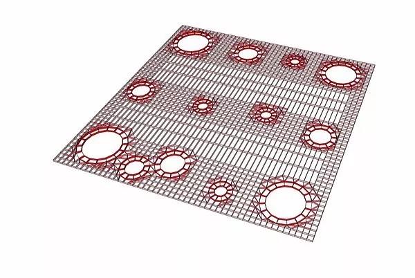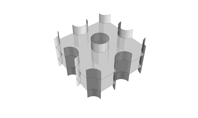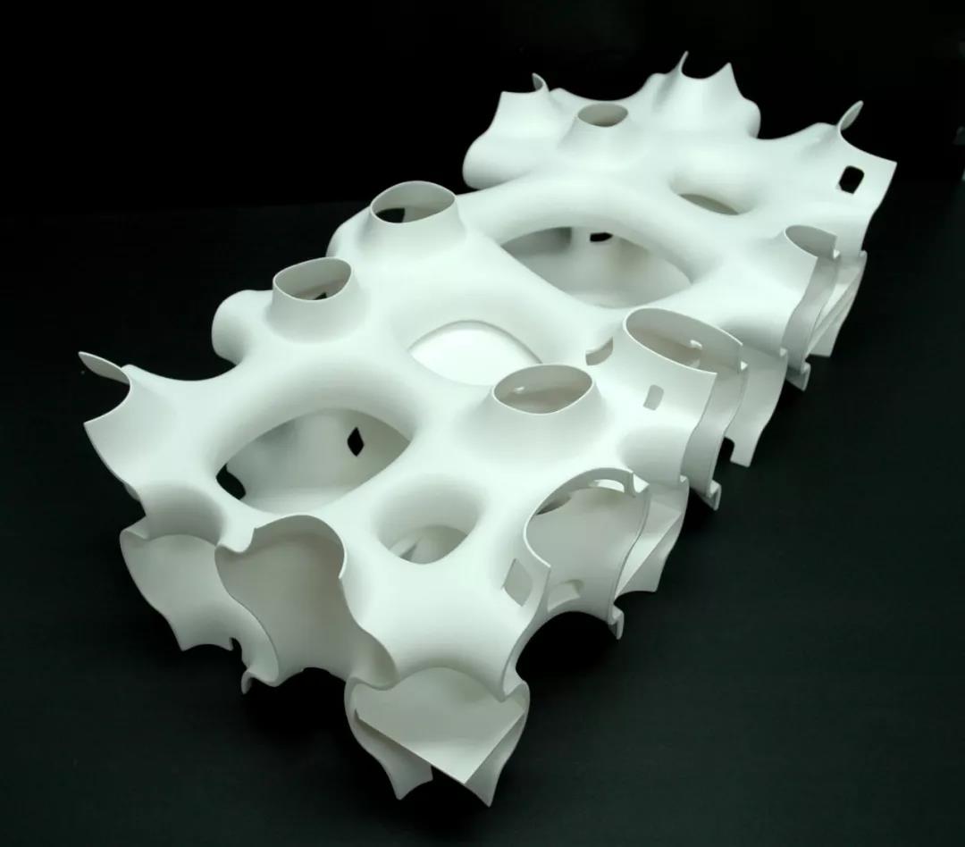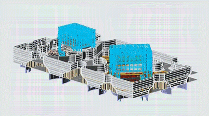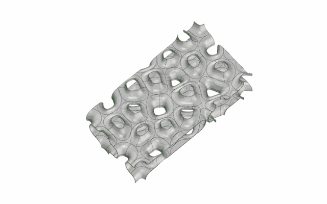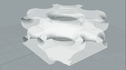 第三步,將原有位于不平面的管柱和樓板,通過曲面的方式,將原有的不同結構,融合在一個連續(xù)的三維曲面中。然后將這個單元塊,在兩個維度中復制并組合。
