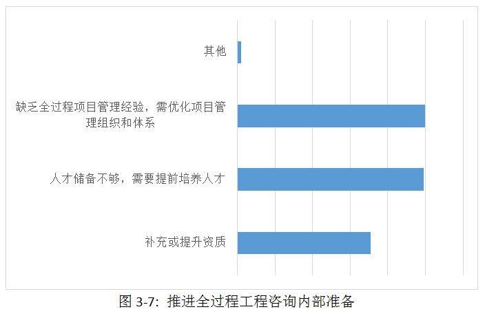 不同性質(zhì)的企業(yè)在推進(jìn)意愿上表現(xiàn)出一定的差異。全民營、國有、混合所有制企業(yè)中都有企業(yè)已經(jīng)有所想法,并已開始準(zhǔn)備,而事業(yè)單位主要持觀望態(tài)度,接受調(diào)研的事業(yè)單位全部都暫時(shí)不考慮,以后再考慮,這可能出于事業(yè)單位體制束縛,在外部資源整合方面缺乏靈活性的擔(dān)心,在目前政策還不完善的情況下,都選擇了觀望態(tài)度。同時(shí)作為本次調(diào)研企業(yè)主體的全民營企業(yè),在推進(jìn)全過程工程咨詢方面態(tài)度也是各有想法,近一半企業(yè)有初步想法,等待政策落地;其次,部分全民營企業(yè)選擇暫時(shí)不考慮,以后再考慮;少數(shù)全民營企業(yè)表示沒有想清楚;個別企業(yè)表示有意愿,已經(jīng)在做準(zhǔn)備。