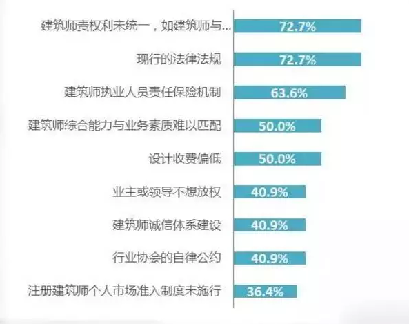 在建筑師的身份定位和業(yè)務范圍,建筑師責權利未統(tǒng)一的情況下,試點困難重重,從各相關方的數(shù)據(jù)反映來看,最主要的困難是現(xiàn)行的法律法規(guī)(72.7%)和建筑師責權利未統(tǒng)一,如建筑師與監(jiān)理的管理職責等(72.7%),其次是建筑師執(zhí)業(yè)人員責任保險機制(63.6%),再次是建筑師綜合能力與業(yè)務素質難以匹配(50.0%)和設計收費偏低(50.0%)等。從這些存在的困難可以發(fā)現(xiàn),聚焦點還是在建筑師的“責權利”問題上。