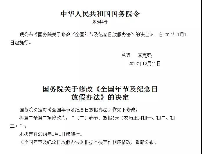 2013 年 12 月,發(fā)布了關(guān)于修改《全國年節(jié)及紀(jì)念日放假辦法的決定》,新修改的辦法指出:將第二條第二項(xiàng)修改為:"(二)春節(jié),放假 3 天(農(nóng)歷正月初一、初二、初三)"。本決定自 2014 年 1 月 1 日起施行。