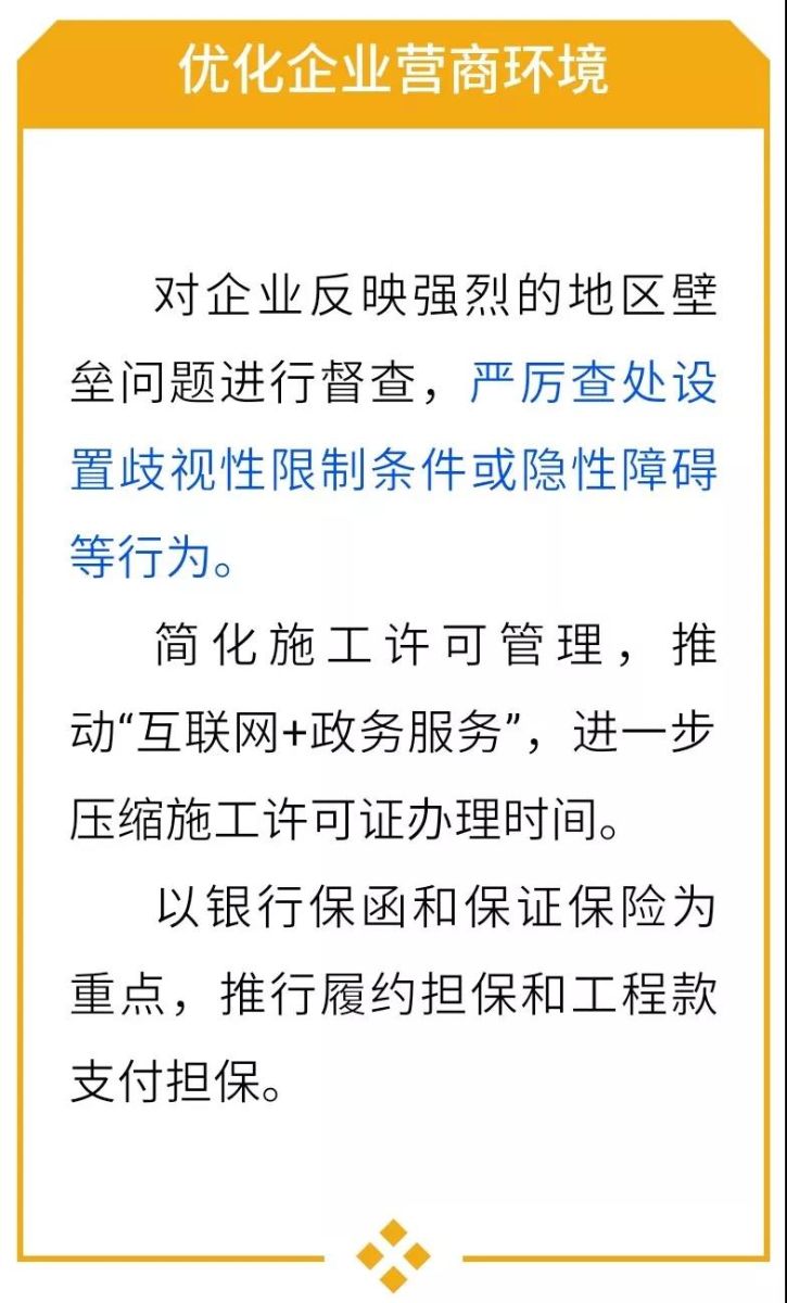 (四)優(yōu)化企業(yè)營商環(huán)境。繼續(xù)推動建立統(tǒng)一開放、公平競爭的建筑市場環(huán)境,對企業(yè)反映強烈的地區(qū)壁壘問題進行督查,嚴厲查處設(shè)置歧視性限制條件或隱性障礙等行為。簡化施工許可管理,推動“互聯(lián)網(wǎng)+政務(wù)服務(wù)”,進一步壓縮施工許可證辦理時間。持續(xù)開展清理規(guī)范工程建設(shè)領(lǐng)域保證金工作,出臺進一步推行工程擔(dān)保的指導(dǎo)意見。以銀行保函和保證保險為重點,推行履約擔(dān)保和工程款支付擔(dān)保。