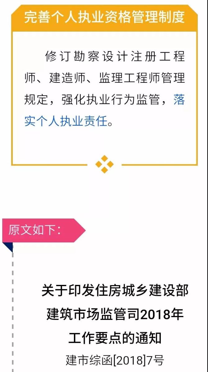 (八)完善個人執(zhí)業(yè)資格管理制度。研究調(diào)整勘察設(shè)計工程師制度總體框架及實施規(guī)劃,優(yōu)化專業(yè)劃分。修訂勘察設(shè)計注冊工程師、建造師、監(jiān)理工程師管理規(guī)定,強化執(zhí)業(yè)行為監(jiān)管,落實個人執(zhí)業(yè)責(zé)任。推動建筑領(lǐng)域國際交流合作,探索開展個人執(zhí)業(yè)資格國際互認。