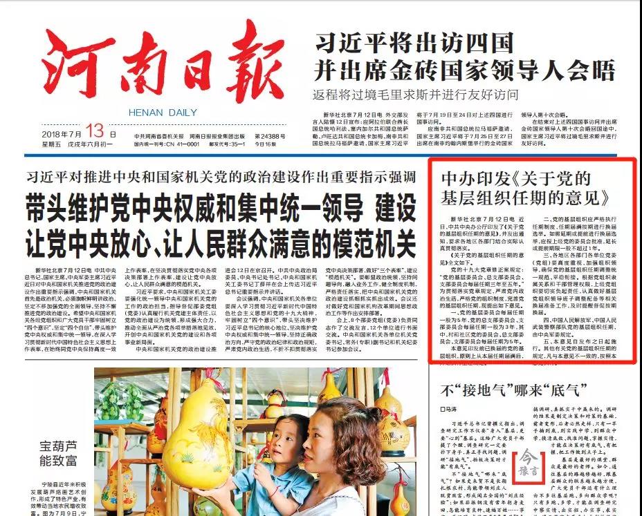 近日,中共中央辦公廳印發(fā)了《關(guān)于黨的基層組織任期的意見》,并發(fā)出通知,要求各地區(qū)各部門結(jié)合實際認真貫徹落實。