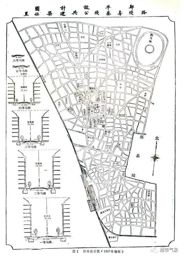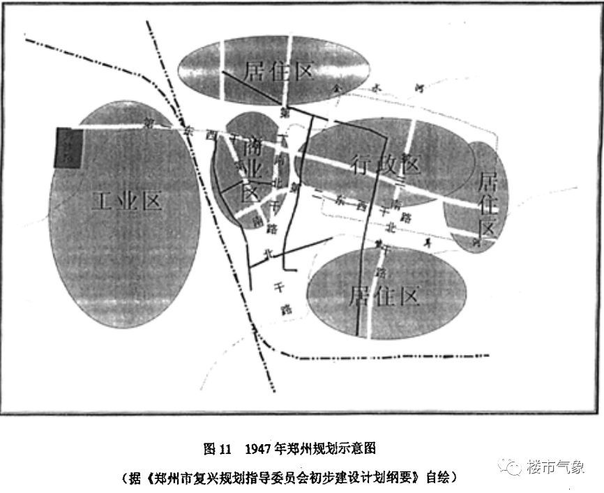 1928~1929年,編制了《鄭州市新中心城區(qū)建設(shè)計(jì)劃草案》。新中心城區(qū)選擇在平漢、隴海兩鐵路車站之西南方,面積35平方千米,人口規(guī)模25萬人。當(dāng)時(shí)舊中心城區(qū)在鐵路東,已有人口8萬。新中心城區(qū)是按17萬人規(guī)劃的。