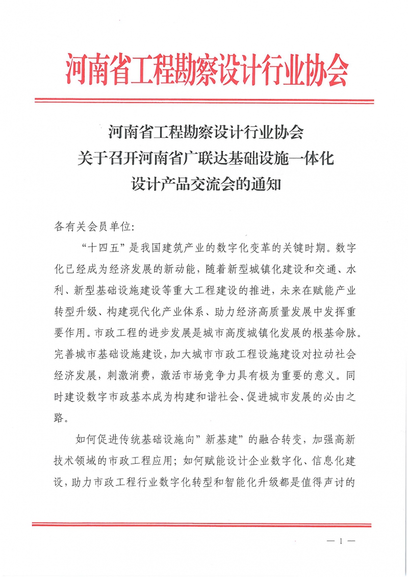 省協(xié)會關(guān)于召開河南省廣聯(lián)達基礎(chǔ)設(shè)施一體化設(shè)計產(chǎn)品交流會的通知